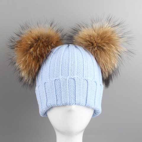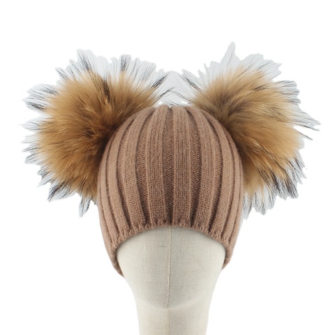 Unisex Nieuwe Echte Wasbeer Dubbele Bont Pom Hoed Mutsen Voor Kinderen Gehaakt Kinderen Gebreide Mutsen Schattig Meisje Jongen Herfst Winter Gebreide Muts